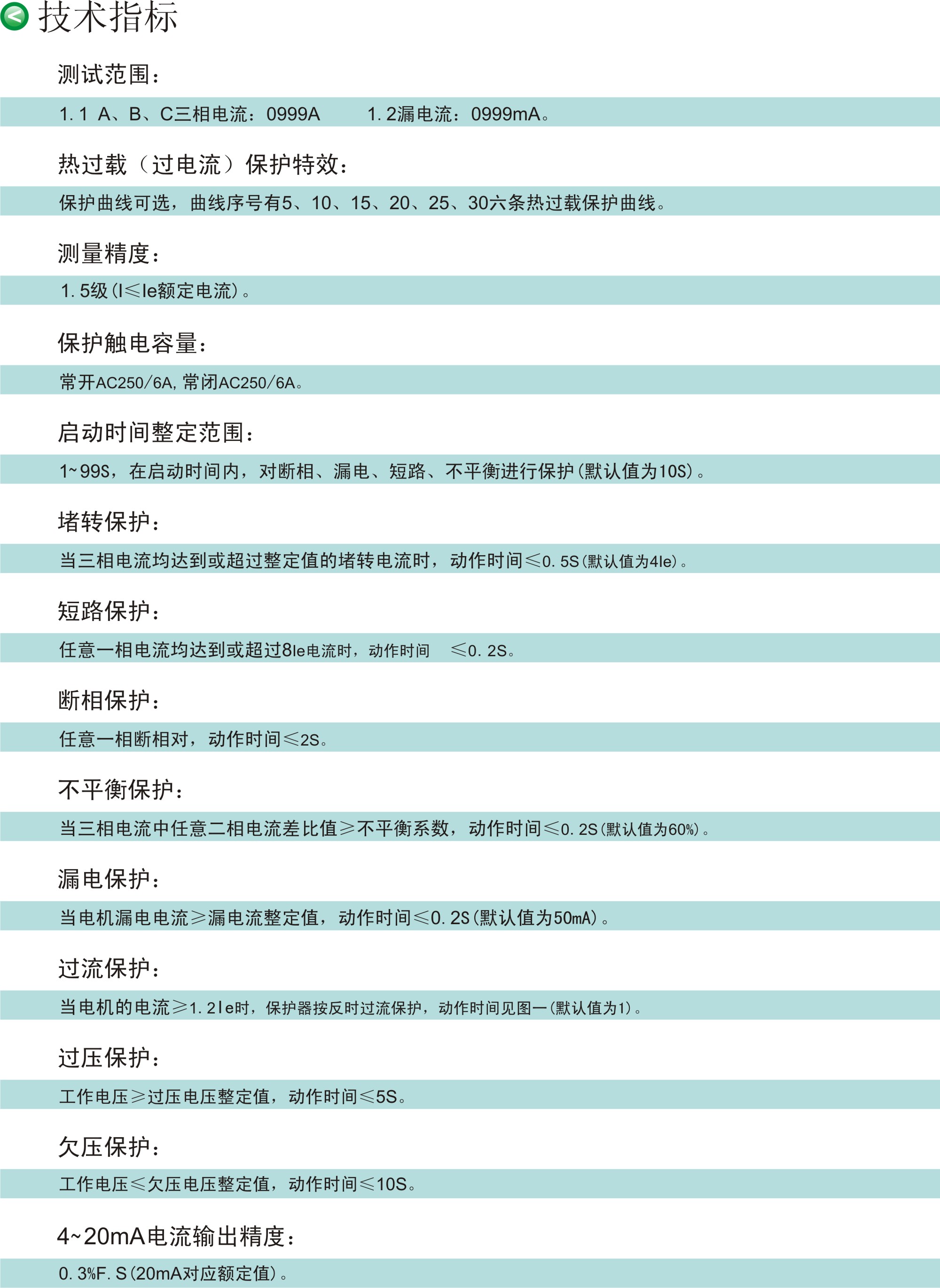 4.1 保护功能:过流、堵转、三相电流不平衡、断相、过压、欠压、漏电、短路等故障保护。